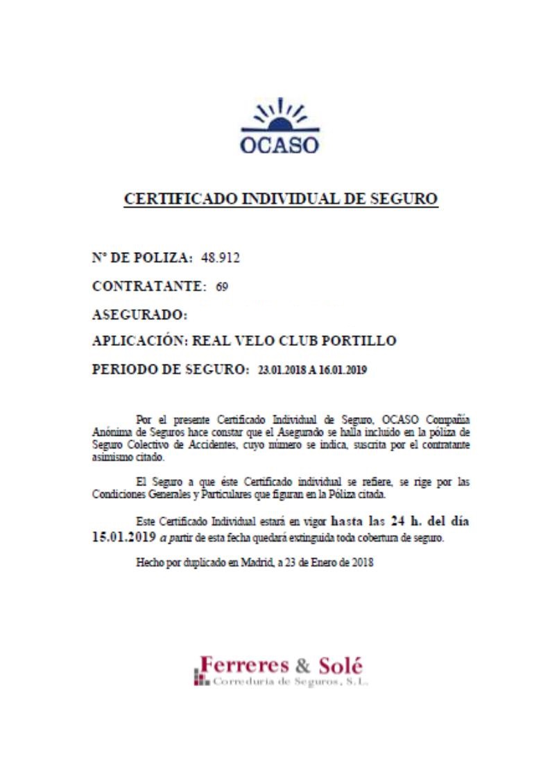 Nuestro Club tiene contratada una póliza de responsabilidad civil y asistencia sanitaria con la Compañía OCASO. La póliza tiene una cobertura de 300.000 euros para responsabilidad civil y asistencia sanitaria ilimitada, todo ello por un precio de 40 euros anuales.
